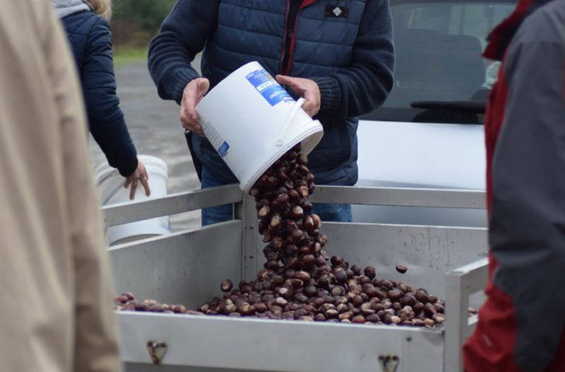 Eine Person kippt Kastanien aus einem Eimer in einen Anhänger